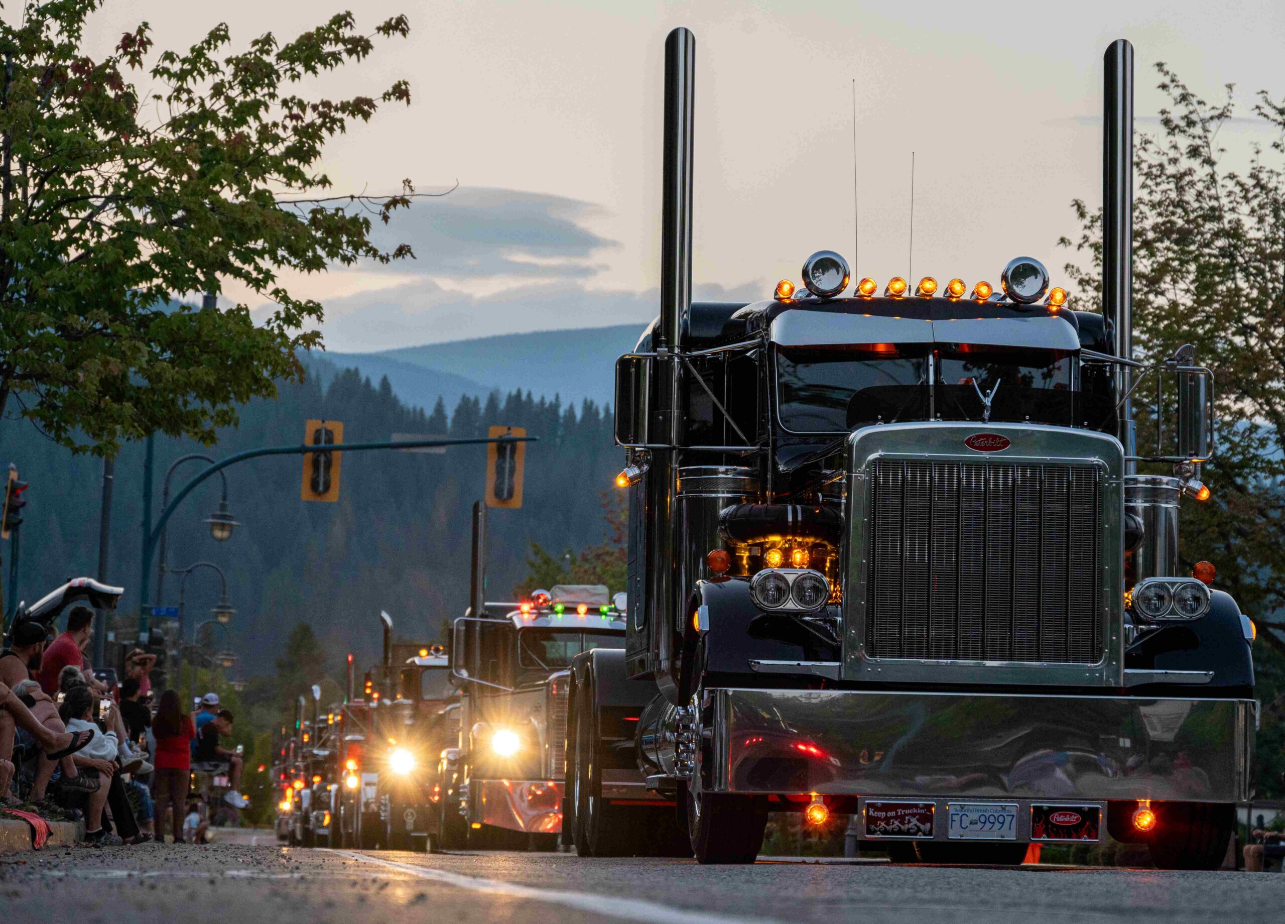 The annual Kootenay BIG RIG Show Cruise goes down Columbia Avenue at parade speed between the Old Theatre and Kootenay Market. Before and after that, they go normal speed. It is a complete loop starting from Bill’s Heavy Duty up by the airport heading north into town and then back again.