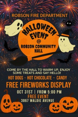 Everyone! its that time of the year again! we are hosting our annual Halloween event at the Robson community hall. This free event has been running for over 40 years and this year is planned to be the best yet! Fireworks display and tons of great new features. The neighborhood offers great trick or treating for the kids. Stop by for free hotdogs, candy, and refreshments. This is one your not going to want to miss!